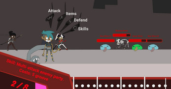 Use WASD to choose your character's actions while trying to strategize how to defeat your enemies. Every turn your party will gain groove, which can either boost your party's attack or be spend to perform a skill. Use your skills and items wisely, which can heal your party, boost your attack, or increase your defense.
